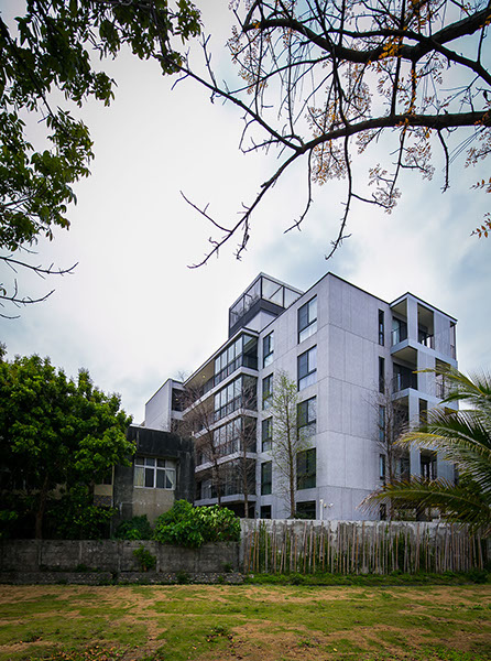 五層公寓的規劃案。 主要的景觀是向西面,為避免向西的開口會有大量的西曬,陽台立面上的設計活動的沖孔版遮陽,不僅是可隔熱通風的皮層,同時在立面上也形成一種秩序與韻律。