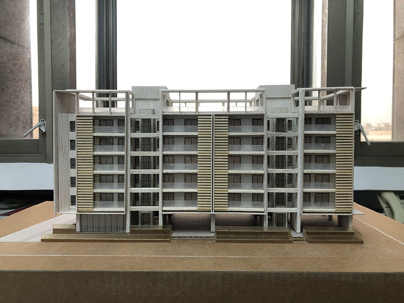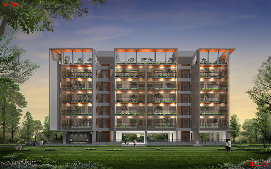 住宅社區 建築環繞中庭水池而建 周遭是一望無際 農村的風景 每層有8戶單元,面臨遊廊式的陽台,設計大面落地窗。 建築是南北向配置,簡單的二房平面,提供了可滿足小巧精緻的生活空間,寬敞景觀陽台讓人感到放鬆、傍晚與家人一同在河堤散步、接近自然是人本能的渴望,在這可以實現對家庭生活美好的想像。