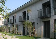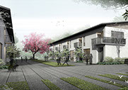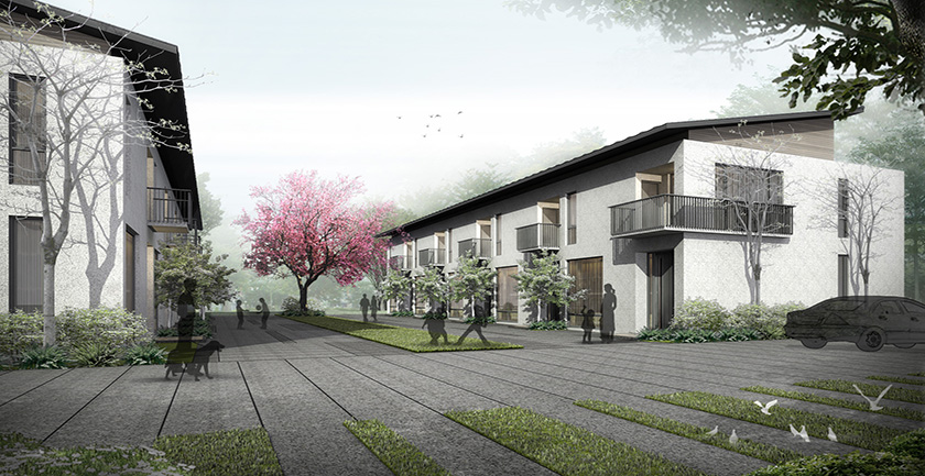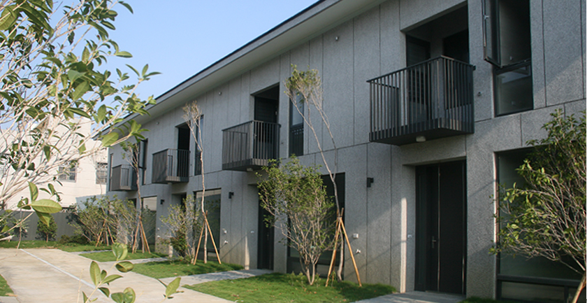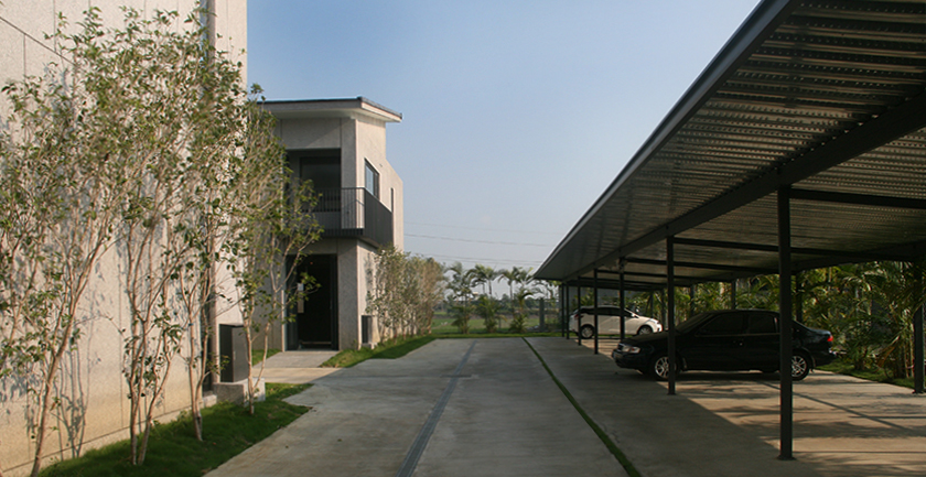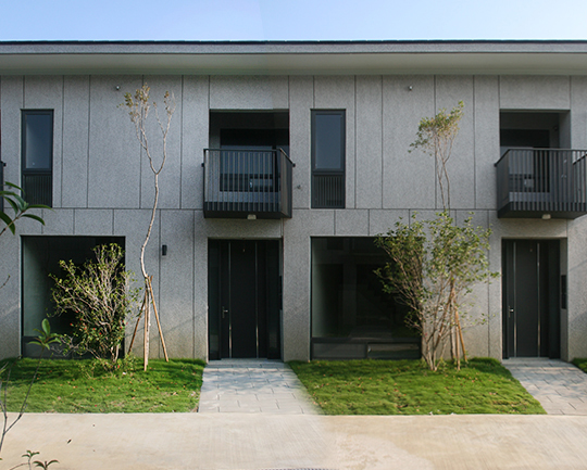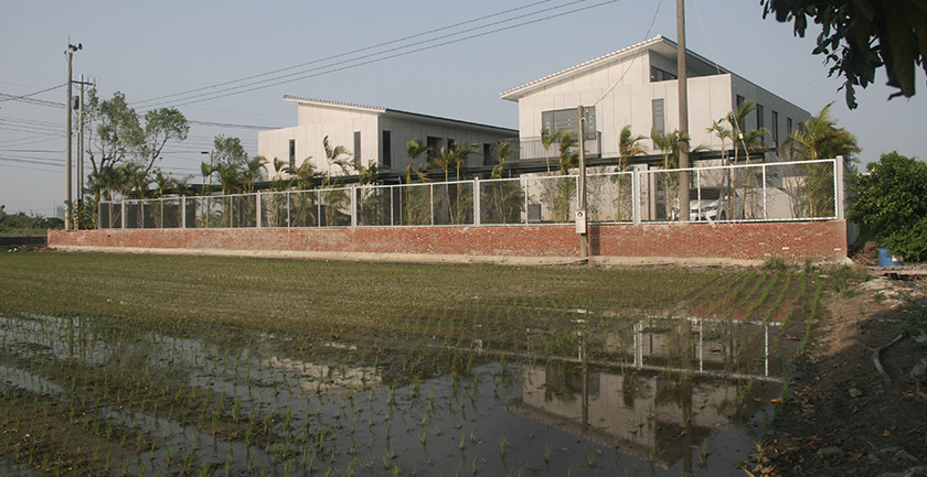 基地位在斗南鄉村聚落的附近,四周是漂亮的田園景緻,二排二層樓的矮房子形成一個微型社區,8戶人家彼此守望相助,人車分道的設計,將停車位集中於基地的一側,每戶有自己的庭院,孩子們在院子裡遊戲。