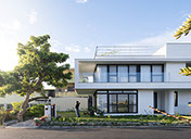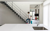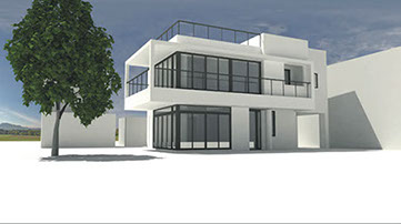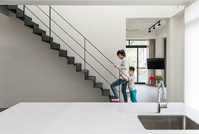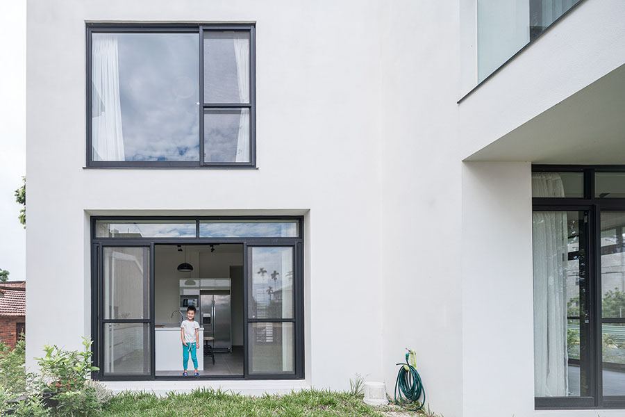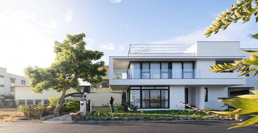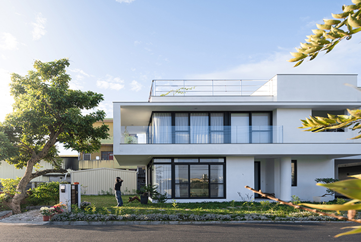 鄉間的小住宅, 房子不要大,空間夠用就好,基地的前後各留有一個庭院,讓建築得以融入自然。 利用水平帶窗,框出美麗的山景與田園風光。