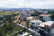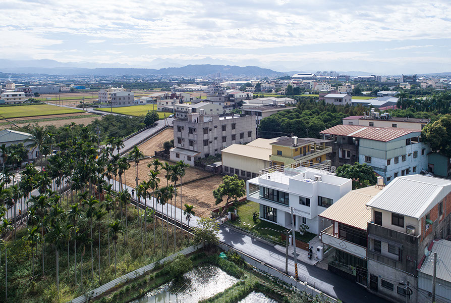 基地位在草屯的鄉間小路旁,四周有群聚的低矮的房舍與田園風光。
