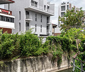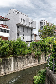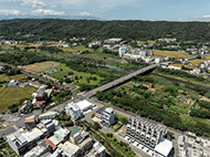 新埔福田段2戶透天基地環境相當豐富有公園、喬木、還有水圳從前方流過。