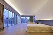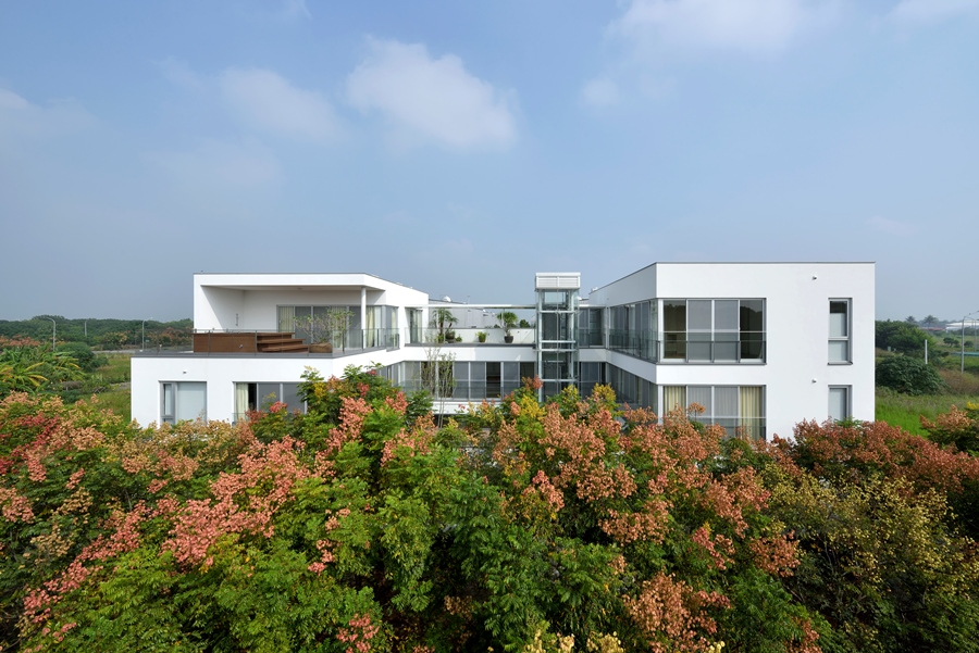 內覽中庭,纖細的光臘樹,以優雅的姿態將地面綠意垂直延伸,錯落引入二樓與三樓的露台,連續了空間的借景;頂層的家庭劇院空間,以木質為裝修基調,再度將暖意推展至戶外SPA平台。在陽光照拂下,輕鬆悠閒地泡在SPA池中,透過樹梢即可平眺蒼鬱的農博腹地。
