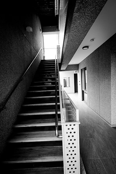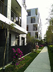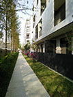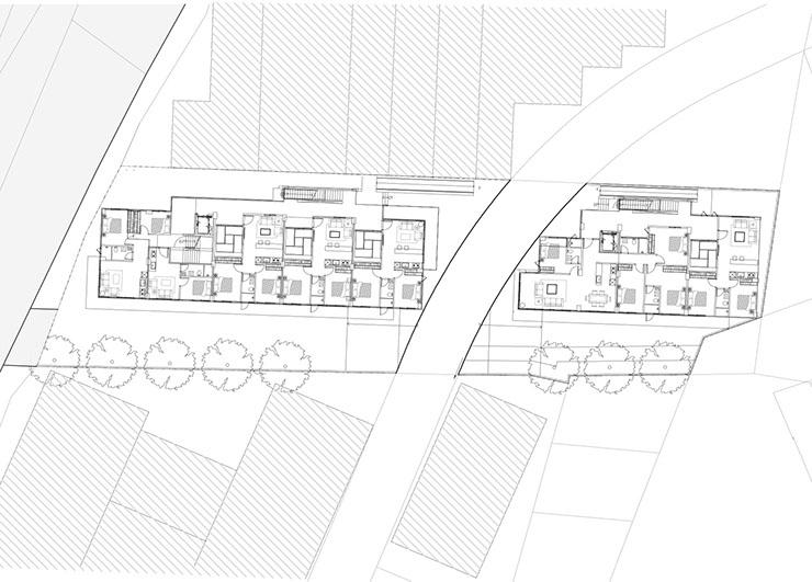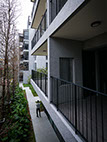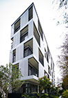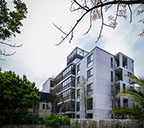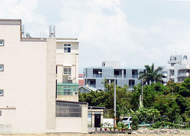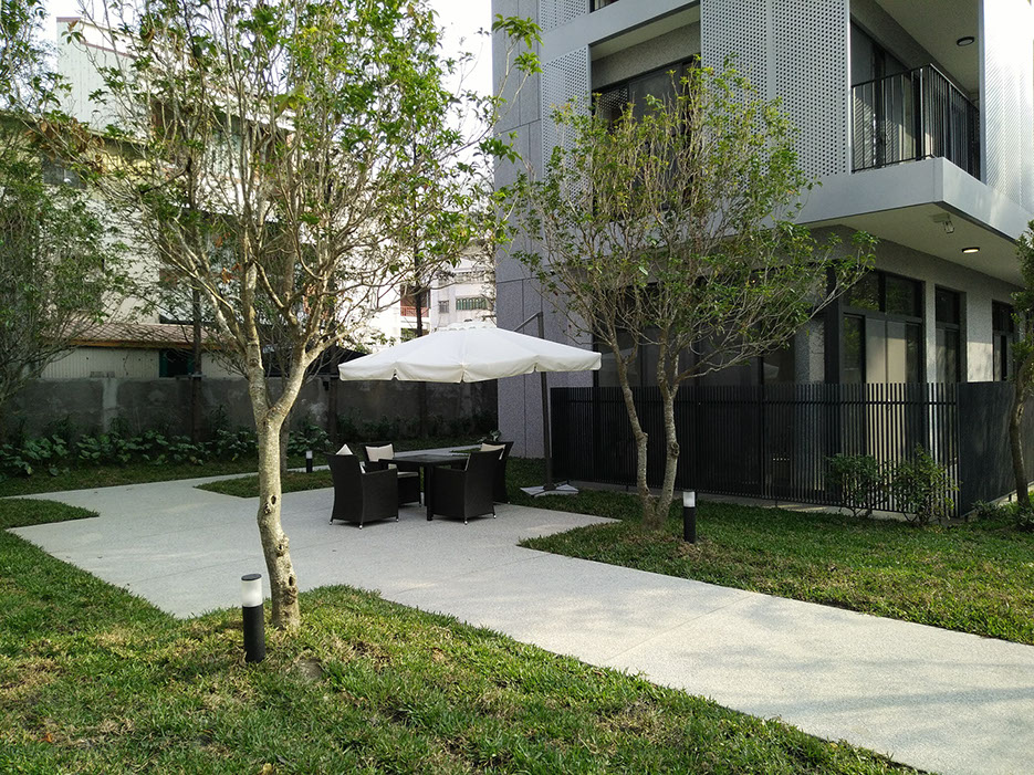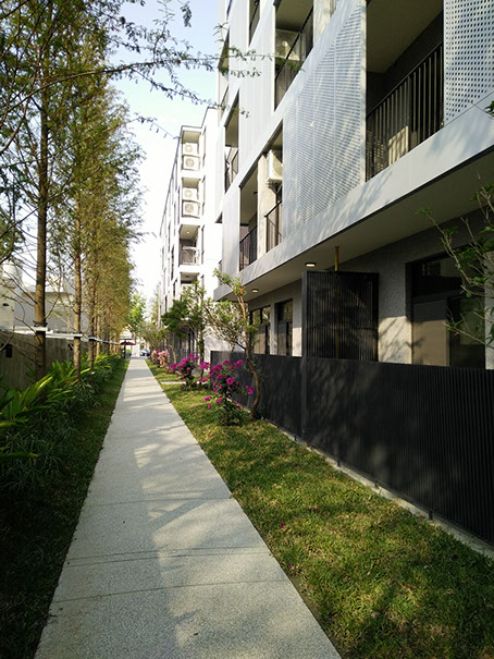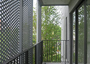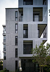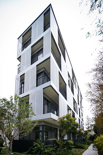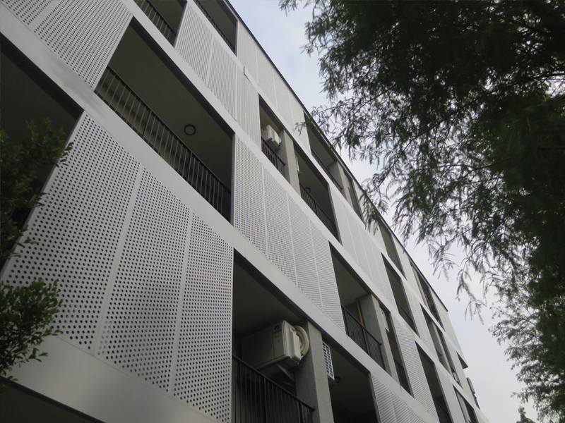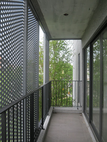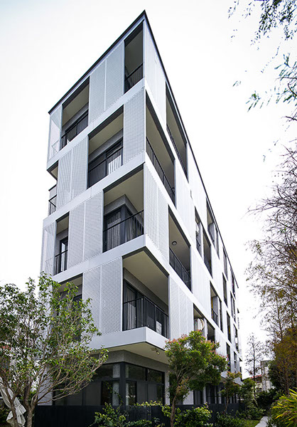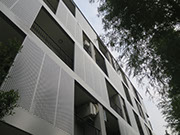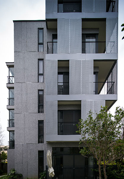 五層公寓的規劃案。 主要的景觀是向西面,為避免向西的開口會有大量的西曬,陽台立面上的設計活動的沖孔版遮陽,不僅是可隔熱通風的皮層,同時在立面上也形成一種秩序與韻律。
